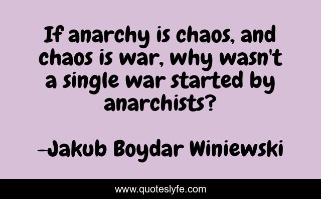 This page presents the quote "If anarchy is chaos, and chaos is war, why wasn't a single war started by anarchists?". Author of this quote is Jakub Bożydar Wiśniewski. This quote is about chaos, peace, anarchy, war, anarchism,.