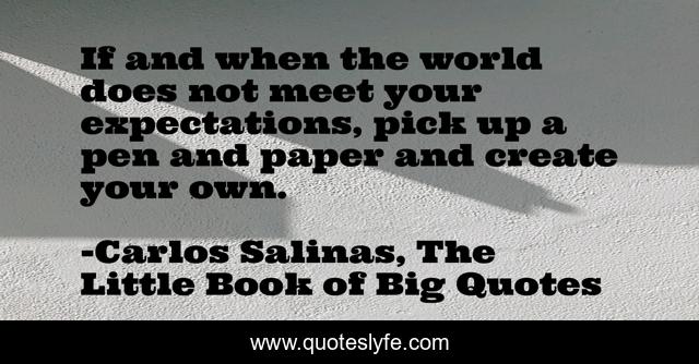 This page presents the quote "If and when the world does not meet your expectations, pick up a pen and paper and create your own.". Author of this quote is Carlos Salinas, The Little Book of Big Quotes. This quote is about quotes, quotes-about-life, carlos-salinas, quotes-to-live-by,.