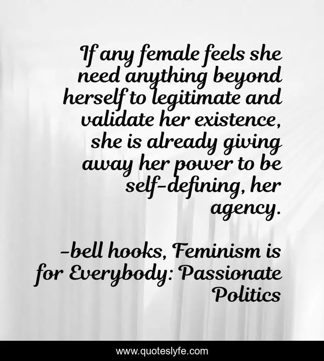 This page presents the quote "If any female feels she need anything beyond herself to legitimate and validate her existence, she is already giving away her power to be self-defining, her agency.". Author of this quote is bell hooks, Feminism is for Everybody: Passionate Politics. .