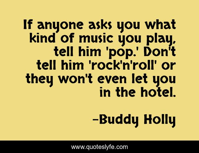 This page presents the quote "If anyone asks you what kind of music you play, tell him 'pop.' Don't tell him 'rock'n'roll' or they won't even let you in the hotel.". Author of this quote is Buddy Holly. This quote is about play, hotel,.