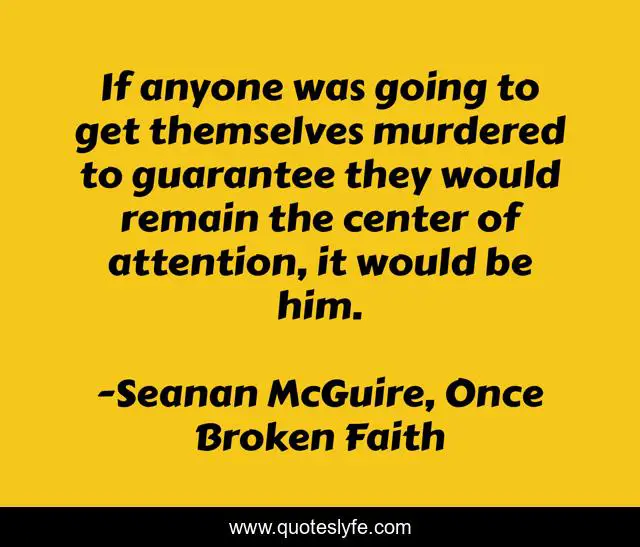 This page presents the quote "If anyone was going to get themselves murdered to guarantee they would remain the center of attention, it would be him.". Author of this quote is Seanan McGuire, Once Broken Faith. This quote is about center-of-attention, murder, murder-mystery,.