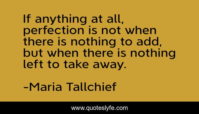 This page presents the quote "If anything at all, perfection is not when there is nothing to add, but when there is nothing left to take away.". Author of this quote is Maria Tallchief. This quote is about ballet, perfection, ballerina-maria-tallchief,.