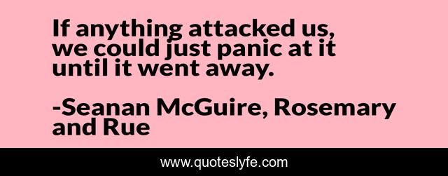 This page presents the quote "If anything attacked us, we could just panic at it until it went away.". Author of this quote is Seanan McGuire, Rosemary and Rue. This quote is about funny, seanan-mcguire, books, ironic, comedy, rosemary-and-rue,.