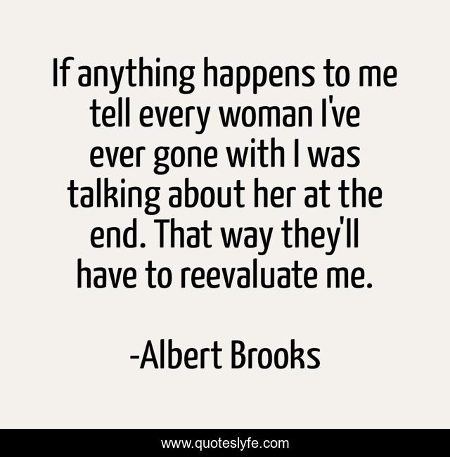 This page presents the quote "If anything happens to me tell every woman I've ever gone with I was talking about her at the end. That way they'll have to reevaluate me.". Author of this quote is Albert Brooks. This quote is about life, death,.