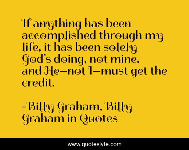 This page presents the quote "If anything has been accomplished through my life, it has been solely God’s doing, not mine, and He—not I—must get the credit.". Author of this quote is Billy Graham, Billy Graham in Quotes. This quote is about life, billy-graham,.
