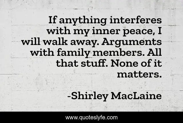 This page presents the quote "If anything interferes with my inner peace, I will walk away. Arguments with family members. All that stuff. None of it matters.". Author of this quote is Shirley MacLaine. This quote is about matters, peace, walk,.