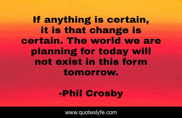 This page presents the quote "If anything is certain, it is that change is certain. The world we are planning for today will not exist in this form tomorrow.". Author of this quote is Phil Crosby. This quote is about world, tomorrow, today,.