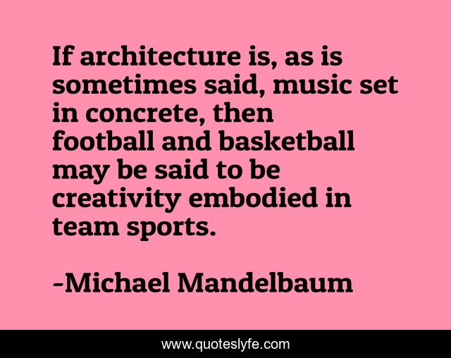 This page presents the quote "If architecture is, as is sometimes said, music set in concrete, then football and basketball may be said to be creativity embodied in team sports.". Author of this quote is Michael Mandelbaum. This quote is about music, architecture,.