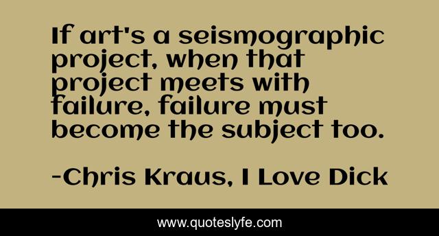 This page presents the quote "If art's a seismographic project, when that project meets with failure, failure must become the subject too.". Author of this quote is Chris Kraus, I Love Dick. This quote is about failure, failing, art, making-art,.