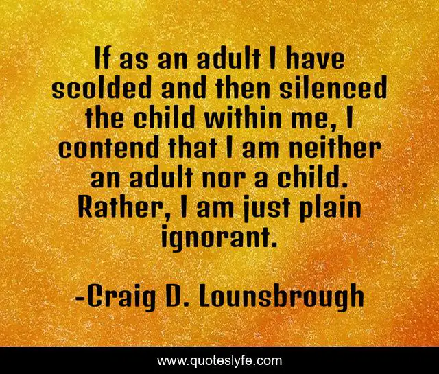 This page presents the quote "If as an adult I have scolded and then silenced the child within me, I contend that I am neither an adult nor a child. Rather, I am just plain ignorant.". Author of this quote is Craig D. Lounsbrough. This quote is about fool, silence, inner-child, silenced, suppress, naive, choices, maturity, stupid,.