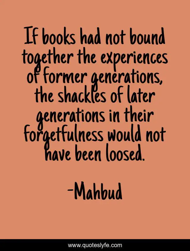 This page presents the quote "If books had not bound together the experiences of former generations, the shackles of later generations in their forgetfulness would not have been loosed.". Author of this quote is Mahbud. .