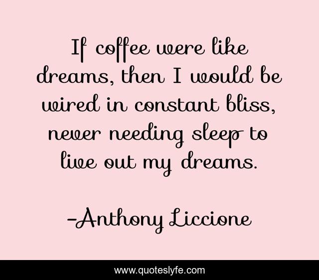 This page presents the quote "If coffee were like dreams, then I would be wired in constant bliss, never needing sleep to live out my dreams.". Author of this quote is Anthony Liccione. This quote is about living, coffee, awake, caffeine, wired, sleep, wishful-thinking, dreams, bliss,.