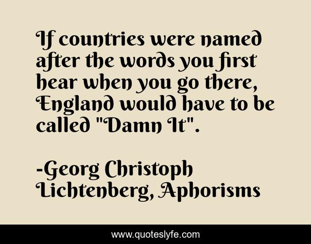 This page presents the quote "If countries were named after the words you first hear when you go there, England would have to be called "Damn It".". Author of this quote is Georg Christoph Lichtenberg, Aphorisms. This quote is about england, humour,.