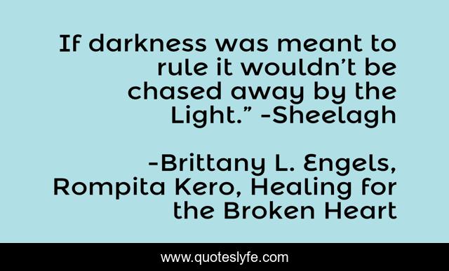 This page presents the quote "If darkness was meant to rule it wouldn’t be chased away by the Light.” -Sheelagh". Author of this quote is Brittany L. Engels, Rompita Kero, Healing for the Broken Heart. This quote is about faith, christian, darkness, light, rule, inspirational, god, enthusiasm,.
