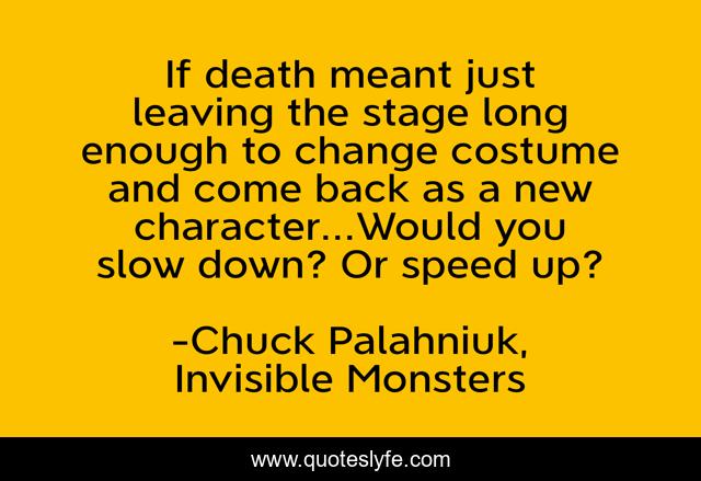 This page presents the quote "If death meant just leaving the stage long enough to change costume and come back as a new character...Would you slow down? Or speed up?". Author of this quote is Chuck Palahniuk, Invisible Monsters. .