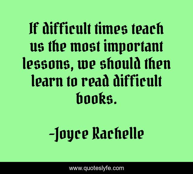 This page presents the quote "If difficult times teach us the most important lessons, we should then learn to read difficult books.". Author of this quote is Joyce Rachelle. This quote is about reading-books, difficult-books, learning-from-books, bookworm, diverse-books, difficulty, life-lessons, reading, issues,.