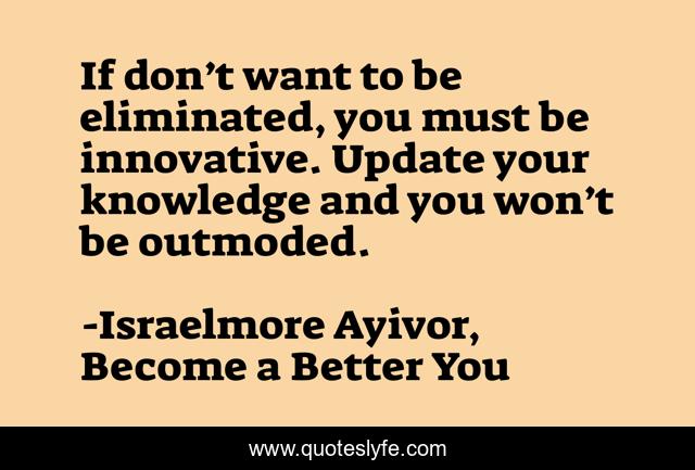 This page presents the quote "If don’t want to be eliminated, you must be innovative. Update your knowledge and you won’t be outmoded.". Author of this quote is Israelmore Ayivor, Become a Better You. This quote is about motivations, food-for-thought, inspirations, knowledge, skills, positive, motivational, update, innovate,.