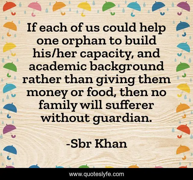 This page presents the quote "If each of us could help one orphan to build his/her capacity, and academic background rather than giving them money or food, then no family will sufferer without guardian.". Author of this quote is Sbr Khan. This quote is about justice-and-mercy, love, peace-on-earth, food, guardian, orphans, education, unity-of-all-people, affection,.