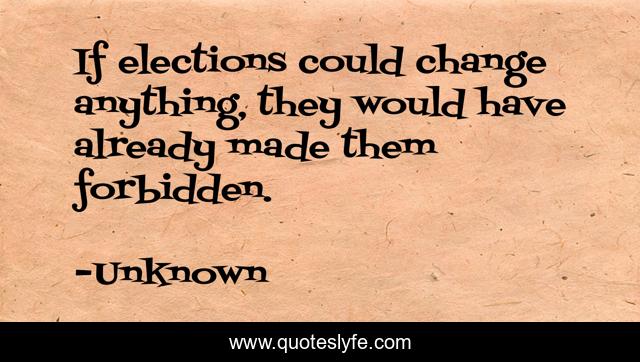 This page presents the quote "If elections could change anything, they would have already made them forbidden.". Author of this quote is Unknown. This quote is about democracy, forbidden, elections, state, anarchy, change,.