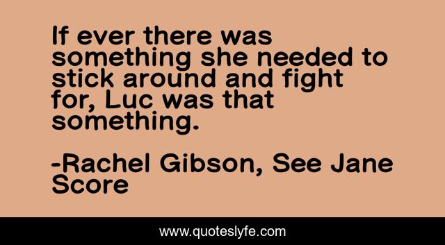 This page presents the quote "If ever there was something she needed to stick around and fight for, Luc was that something.". Author of this quote is Rachel Gibson, See Jane Score. This quote is about romance, chinooks-series, humor, rachel-gibson, see-jane-score,.