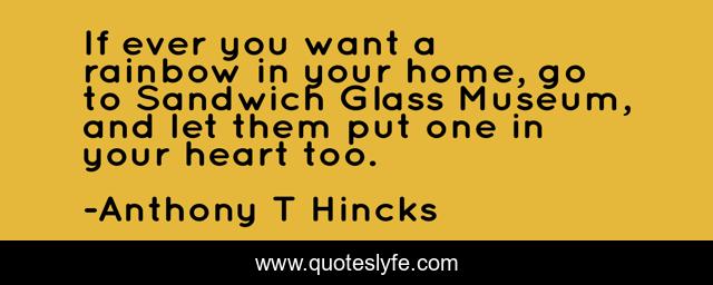 This page presents the quote "If ever you want a rainbow in your home, go to Sandwich Glass Museum, and let them put one in your heart too.". Author of this quote is Anthony T Hincks. This quote is about rainbow, love, color, rainbows, colour, philosophy, visit, colours-go-to, glass,.