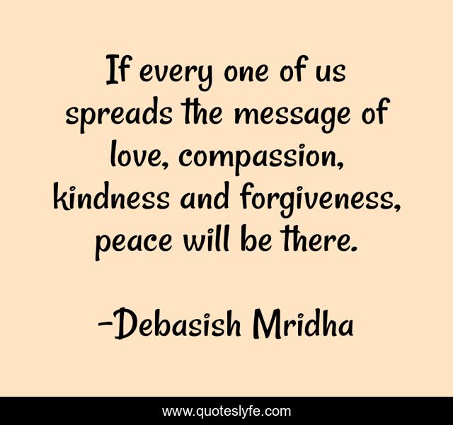 This page presents the quote "If every one of us spreads the message of love, compassion, kindness and forgiveness, peace will be there.". Author of this quote is Debasish Mridha. This quote is about life, love, knowledge, inspirational, intelligence, philosophy, wisdom, quotes, affection,.