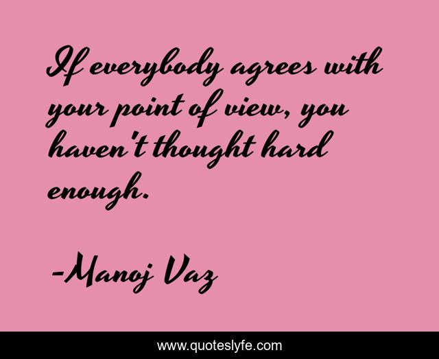 This page presents the quote "If everybody agrees with your point of view, you haven't thought hard enough.". Author of this quote is Manoj Vaz. This quote is about life-philosophy, corporate, life-lessons, point-of-view,.