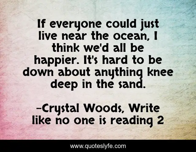 This page presents the quote "If everyone could just live near the ocean, I think we'd all be happier. It's hard to be down about anything knee deep in the sand.". Author of this quote is Crystal Woods, Write like no one is reading 2. This quote is about sandy-beaches, serene, dominican-republic, happier, sunshine, ocean, water, sand, cure,.