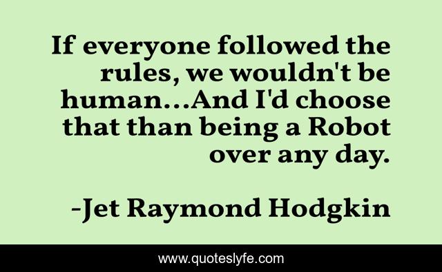 This page presents the quote "If everyone followed the rules, we wouldn't be human...And I'd choose that than being a Robot over any day.". Author of this quote is Jet Raymond Hodgkin. This quote is about rules, human, robots, truth,.