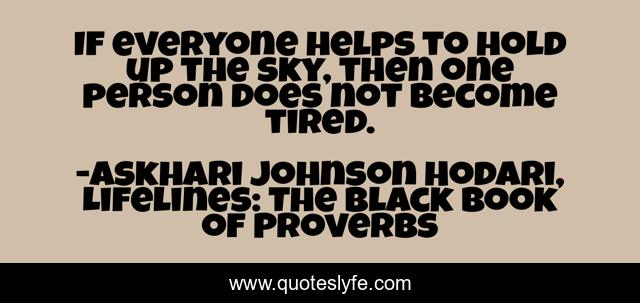 This page presents the quote "If everyone helps to hold up the sky, then one person does not become tired.". Author of this quote is Askhari Johnson Hodari, Lifelines: The Black Book of Proverbs. This quote is about proverbs, cooperation, wisdom, unity, inspirational, african, enthusiasm,.