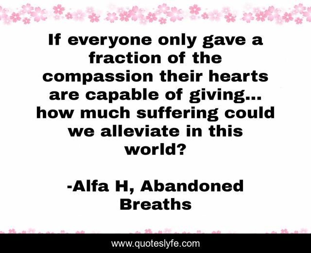 This page presents the quote "If everyone only gave a fraction of the compassion their hearts are capable of giving... how much suffering could we alleviate in this world?". Author of this quote is Alfa H, Abandoned Breaths. This quote is about love, compassion, poetry, giving, suffering, kindness, affection, inspiration,.