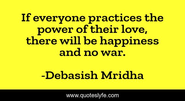 This page presents the quote "If everyone practices the power of their love, there will be happiness and no war.". Author of this quote is Debasish Mridha. This quote is about life, love, knowledge, inspirational, intelligence, philosophy, wisdom, quotes, affection,.