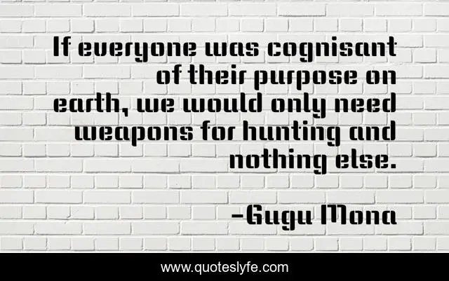 This page presents the quote "If everyone was cognisant of their purpose on earth, we would only need weapons for hunting and nothing else.". Author of this quote is Gugu Mona. This quote is about everyone, hunting, weapons, purpose, cognisant, earth,.