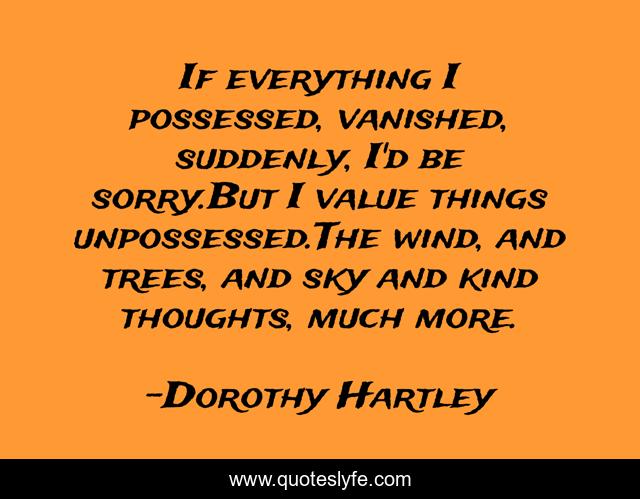 This page presents the quote "If everything I possessed, vanished, suddenly, I'd be sorry.But I value things unpossessed.The wind, and trees, and sky and kind thoughts, much more.". Author of this quote is Dorothy Hartley. This quote is about possessions, sky, tree, value, kindness, wind,.