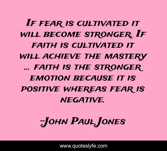 This page presents the quote "If fear is cultivated it will become stronger. If faith is cultivated it will achieve the mastery ... faith is the stronger emotion because it is positive whereas fear is negative.". Author of this quote is John Paul Jones. This quote is about success, happiness,.