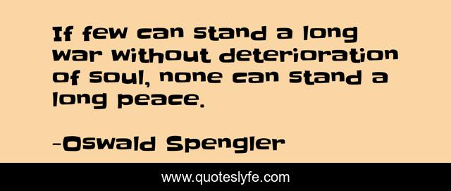 This page presents the quote "If few can stand a long war without deterioration of soul, none can stand a long peace.". Author of this quote is Oswald Spengler. This quote is about peace, soul, long,.