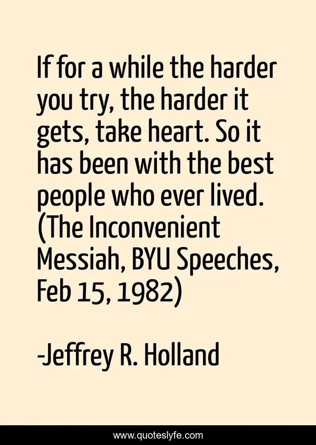 This page presents the quote "If for a while the harder you try, the harder it gets, take heart. So it has been with the best people who ever lived. (The Inconvenient Messiah, BYU Speeches, Feb 15, 1982)". Author of this quote is Jeffrey R. Holland. .