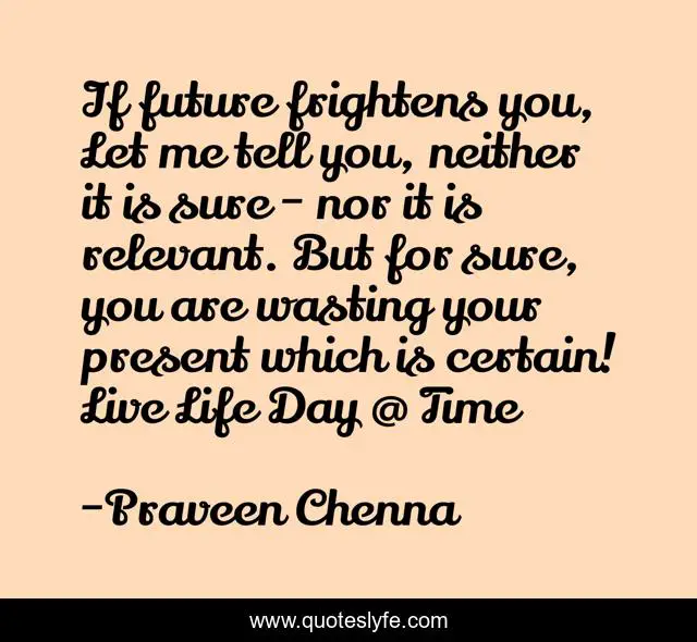 This page presents the quote "If future frightens you, Let me tell you, neither it is sure - nor it is relevant. But for sure, you are wasting your present which is certain! Live Life Day @ Time". Author of this quote is Praveen Chenna. This quote is about life, praveen-chenna, future, present,.