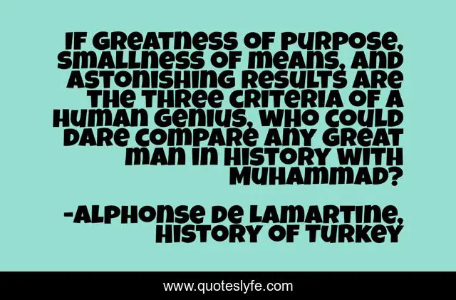 This page presents the quote "If greatness of purpose, smallness of means, and astonishing results are the three criteria of a human genius, who could dare compare any great man in history with Muhammad?". Author of this quote is Alphonse de Lamartine, History of Turkey. This quote is about muhammad, lamartine, islam,.