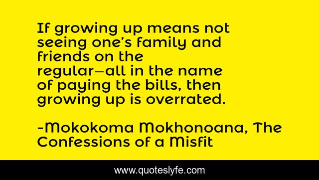 This page presents the quote "If growing up means not seeing one’s family and friends on the regular—all in the name of paying the bills, then growing up is overrated.". Author of this quote is Mokokoma Mokhonoana, The Confessions of a Misfit. This quote is about employment, work, friends, job, rent, bills, friendship,.