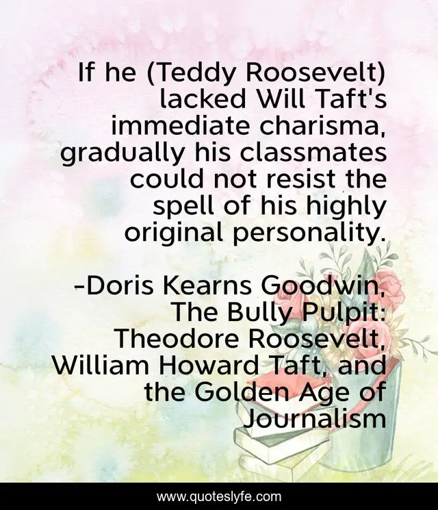 This page presents the quote "If he (Teddy Roosevelt) lacked Will Taft's immediate charisma, gradually his classmates could not resist the spell of his highly original personality.". Author of this quote is Doris Kearns Goodwin, The Bully Pulpit: Theodore Roosevelt, William Howard Taft, and the Golden Age of Journalism. This quote is about individuality, curiosity,.