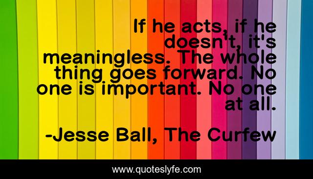 This page presents the quote "If he acts, if he doesn't, it's meaningless. The whole thing goes forward. No one is important. No one at all.". Author of this quote is Jesse Ball, The Curfew. This quote is about action, life, inaction,.