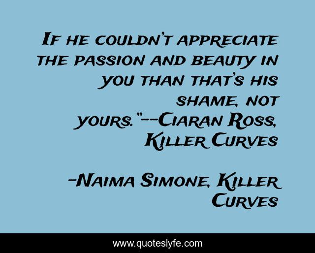 This page presents the quote "If he couldn’t appreciate the passion and beauty in you than that’s his shame, not yours.”--Ciaran Ross, Killer Curves". Author of this quote is Naima Simone, Killer Curves. This quote is about bbw-romance, erotic-romance, alpha-hero, romantic-suspense,.