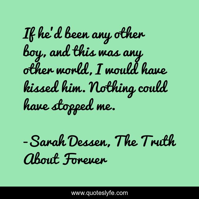 This page presents the quote "If he'd been any other boy, and this was any other world, I would have kissed him. Nothing could have stopped me.". Author of this quote is Sarah Dessen, The Truth About Forever. This quote is about forbidden, kiss, love, macy-and-wes, affection,.