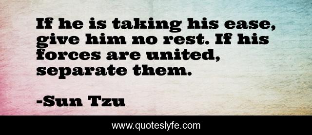 This page presents the quote "If he is taking his ease, give him no rest. If his forces are united, separate them.". Author of this quote is Sun Tzu. This quote is about war, strategy,.