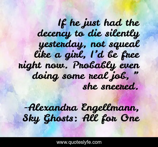 This page presents the quote "If he just had the decency to die silently yesterday, not squeal like a girl, I’d be free right now. Probably even doing some real job, ” she sneered.". Author of this quote is Alexandra Engellmann, Sky Ghosts: All for One. This quote is about action, drama, romance, urban-fantasy, young-adult,.