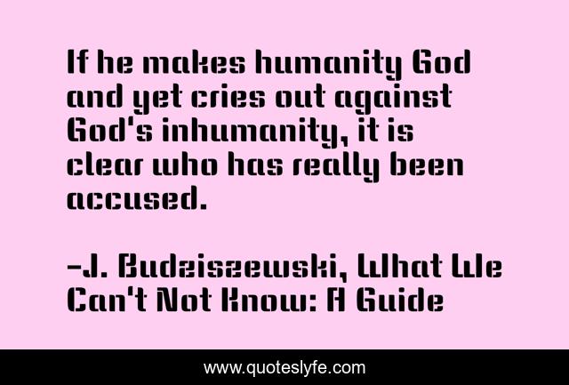 This page presents the quote "If he makes humanity God and yet cries out against God's inhumanity, it is clear who has really been accused.". Author of this quote is J. Budziszewski, What We Can't Not Know: A Guide. This quote is about god, philosophy, humanism, humanity,.
