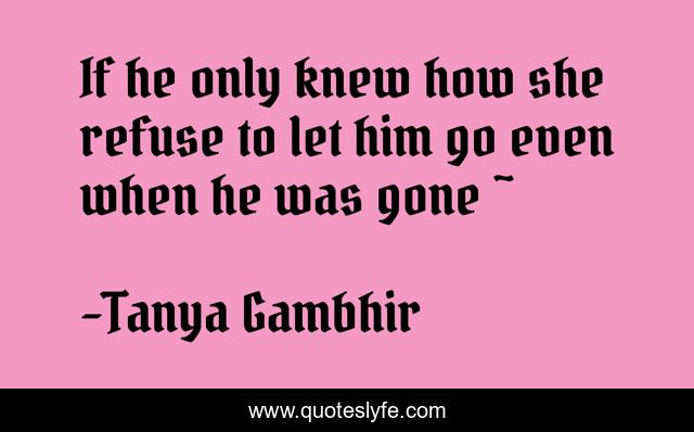 This page presents the quote "If he only knew how she refuse to let him go even when he was gone ~". Author of this quote is Tanya Gambhir. This quote is about walking-on-a-thin-line, letting-go, breakup, quotes, she, girl,.