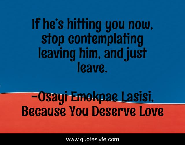 This page presents the quote "If he’s hitting you now, stop contemplating leaving him, and just leave.". Author of this quote is Osayi Emokpae Lasisi, Because You Deserve Love. This quote is about breakup, abuse, relationship,.