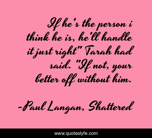 This page presents the quote "If he's the person i think he is, he'll handle it just right" Tarah had said. "If not, your better off without him.". Author of this quote is Paul Langan, Shattered. .
